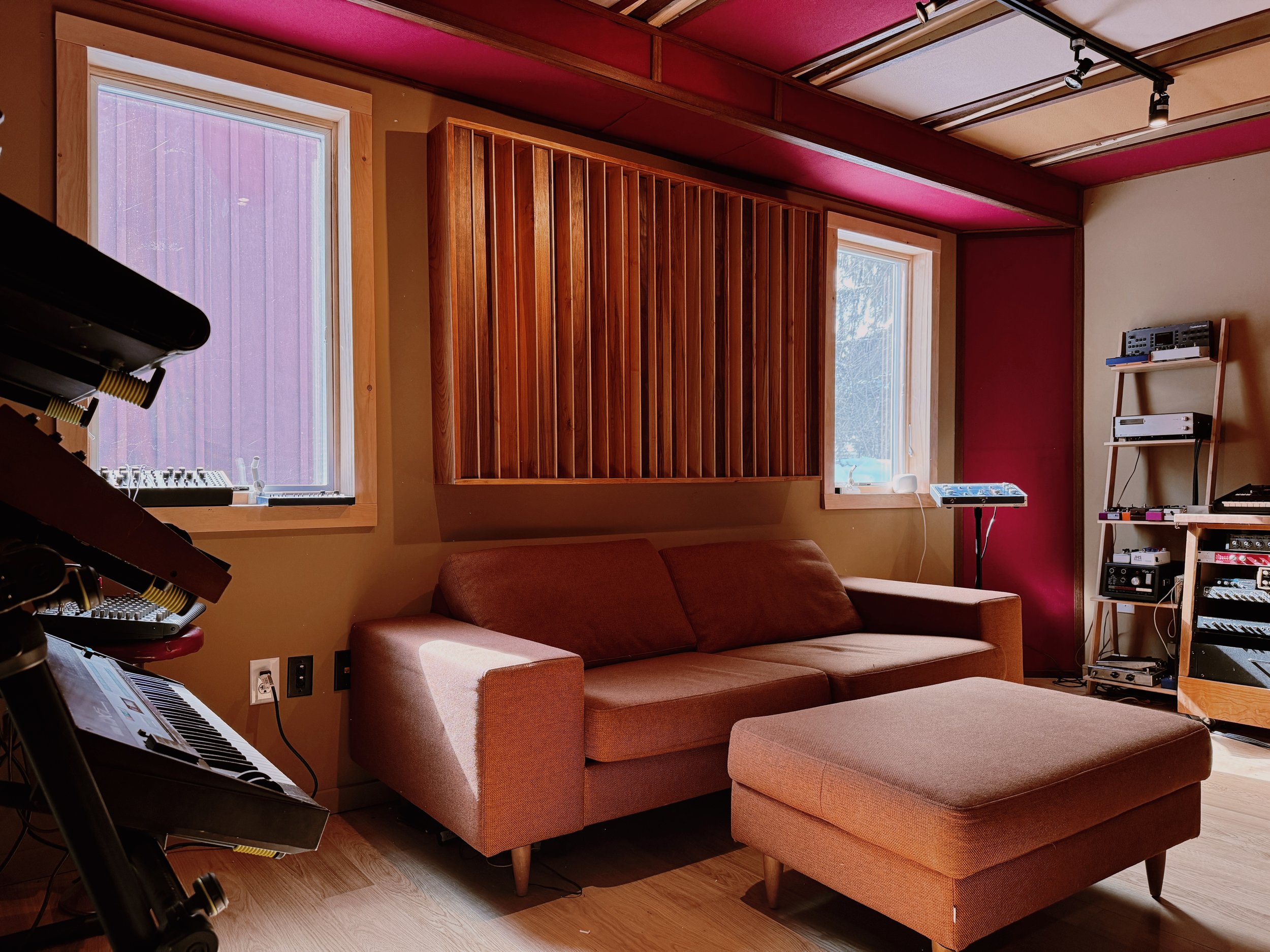 A refrain I hear from artists a lot these days is, “as soon as I walked in, I felt like I was home.” In my design - from the color scheme to the furniture choices to the custom cherry gear racks and diffusers - I endeavored to make the space feel rooted but elevated. For much of my acoustic treatment, I recycled wood that we removed from the siding of the barn during our rebuild. In the live room, between the Altec live room speakers, there is a full wall of barnwood siding in a sawtooth pattern to throw it out of parallel with the opposite wall. Throughout the design, the lines between indoor and outdoor, the naturally-occurring and acoustically-engineered, are smudged. You are inside a live room straight out of ‘70s Los Angeles, while you are simultaneously in a former Hudson Valley horse barn.