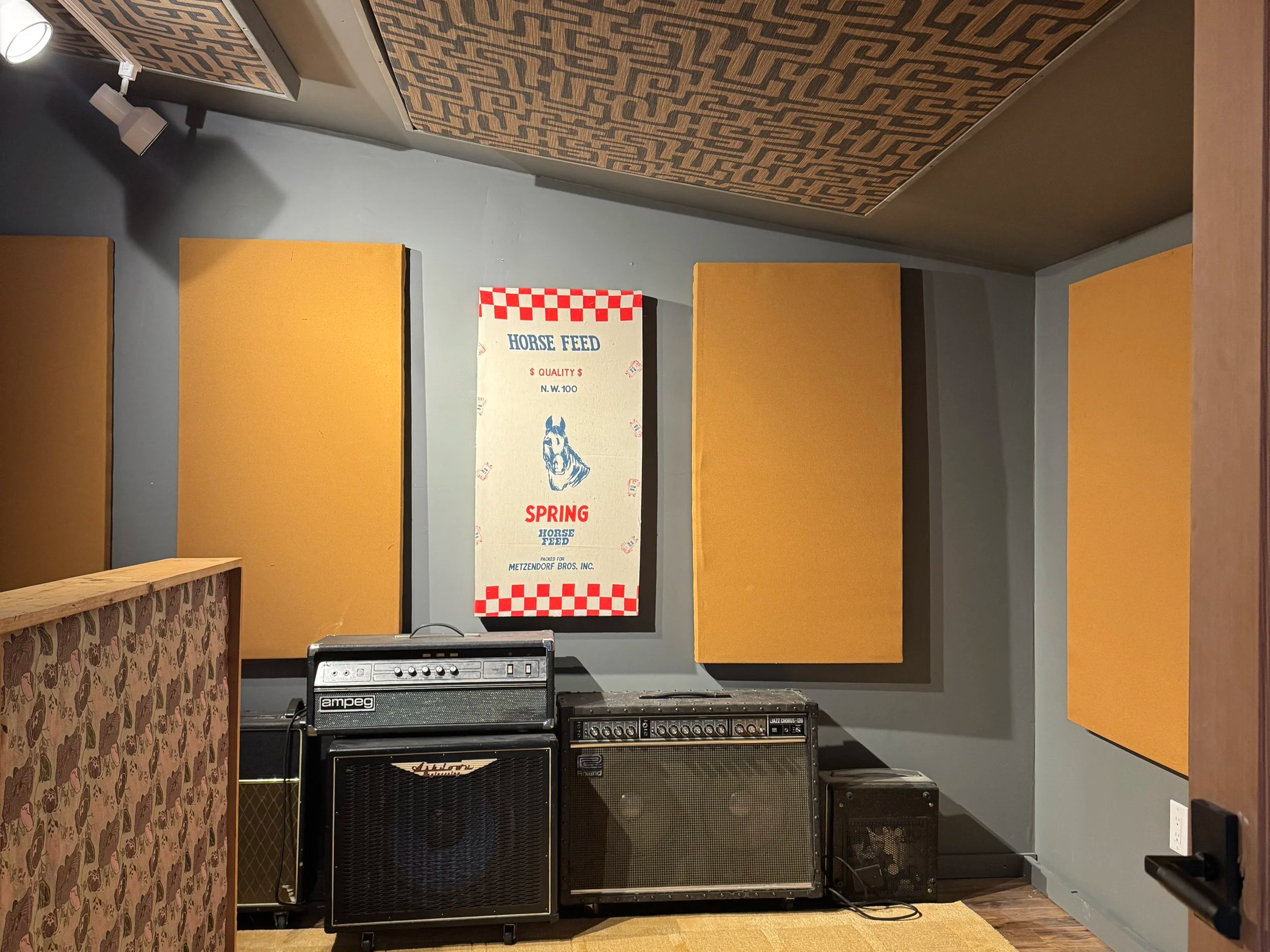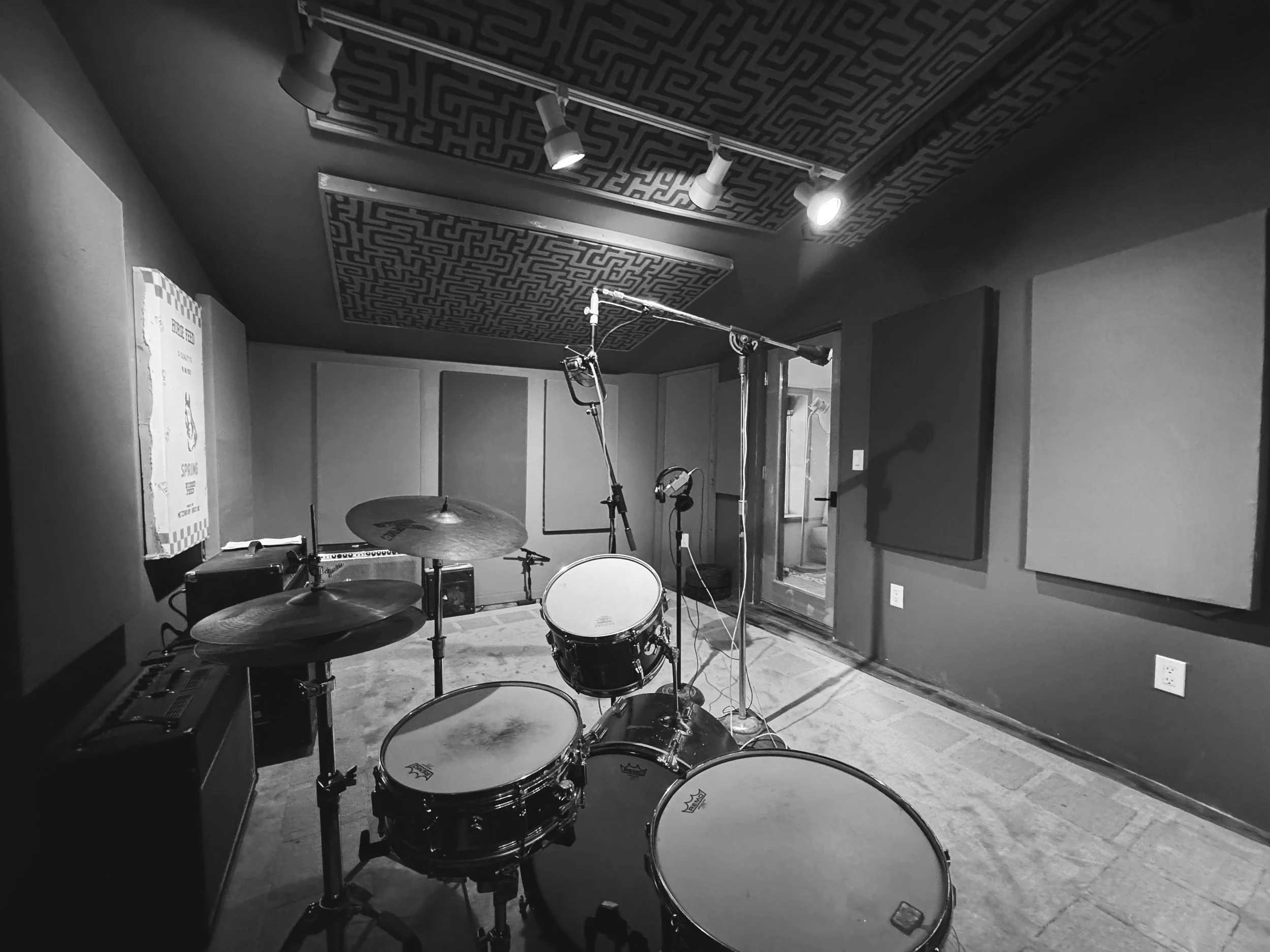 The live room is exhaustively de-coupled from the adjacent control room for precise monitoring. Adjoining the live room is a sizable iso room, a green room area separated by thick curtains for semi-isolation, and a hallway with sight lines into the main area. Above the control room is an echo chamber which doubles as a site for additional isolation.