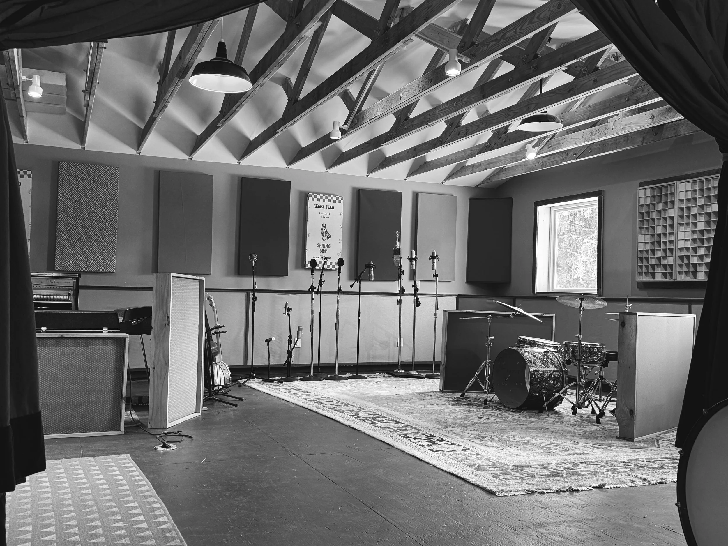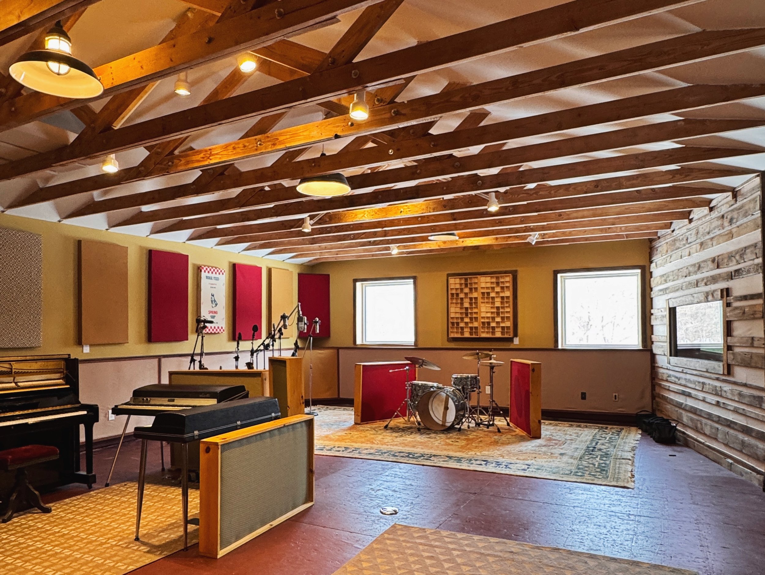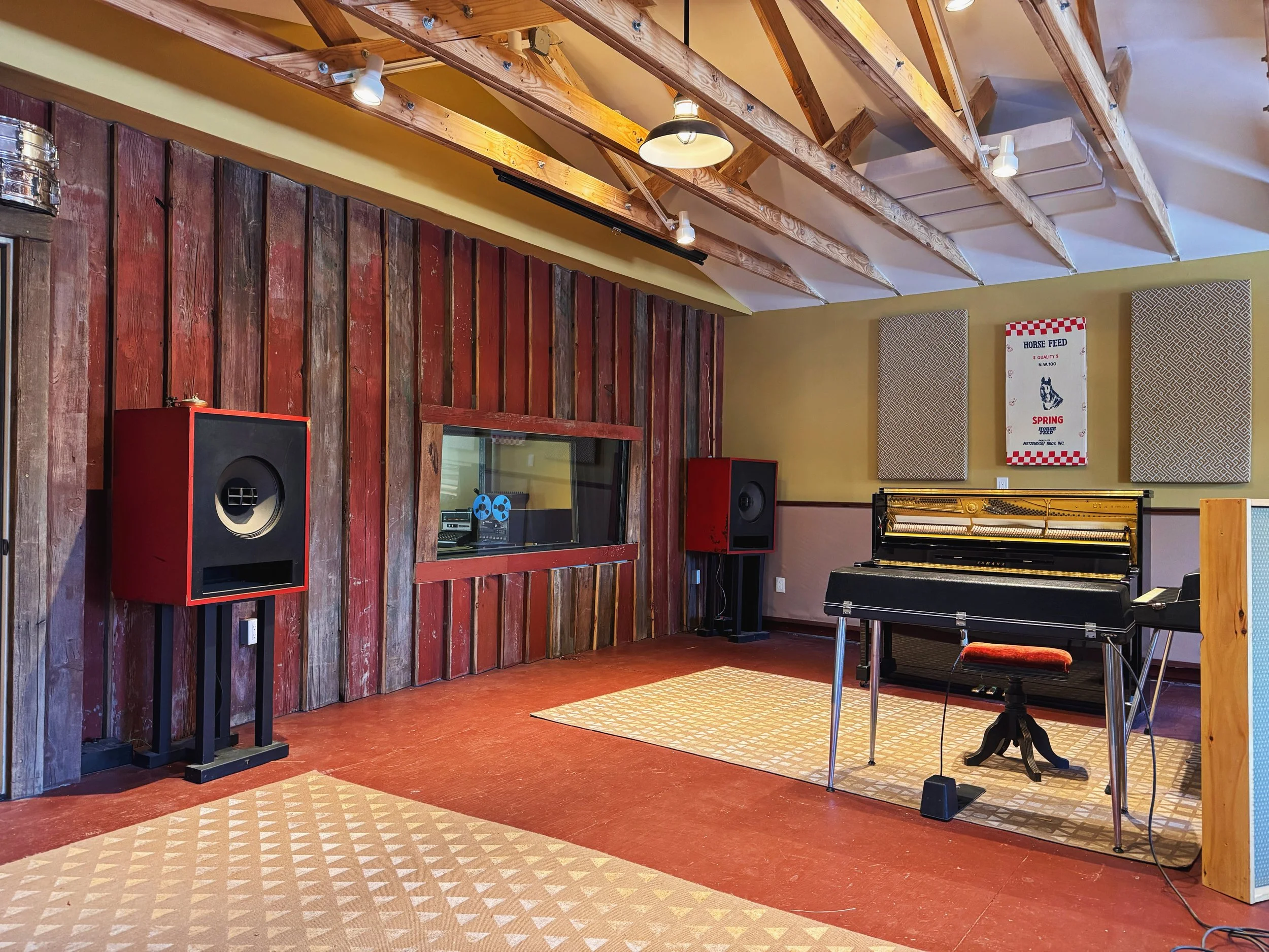 Studio A’s live room is 800 sq ft. with 12 ft gabled ceilings. The sound is partially controlled by thick gobos around the perimeter & ample wall treatment. But also - with no two walls in parallel - a rich and focused room sound is present.